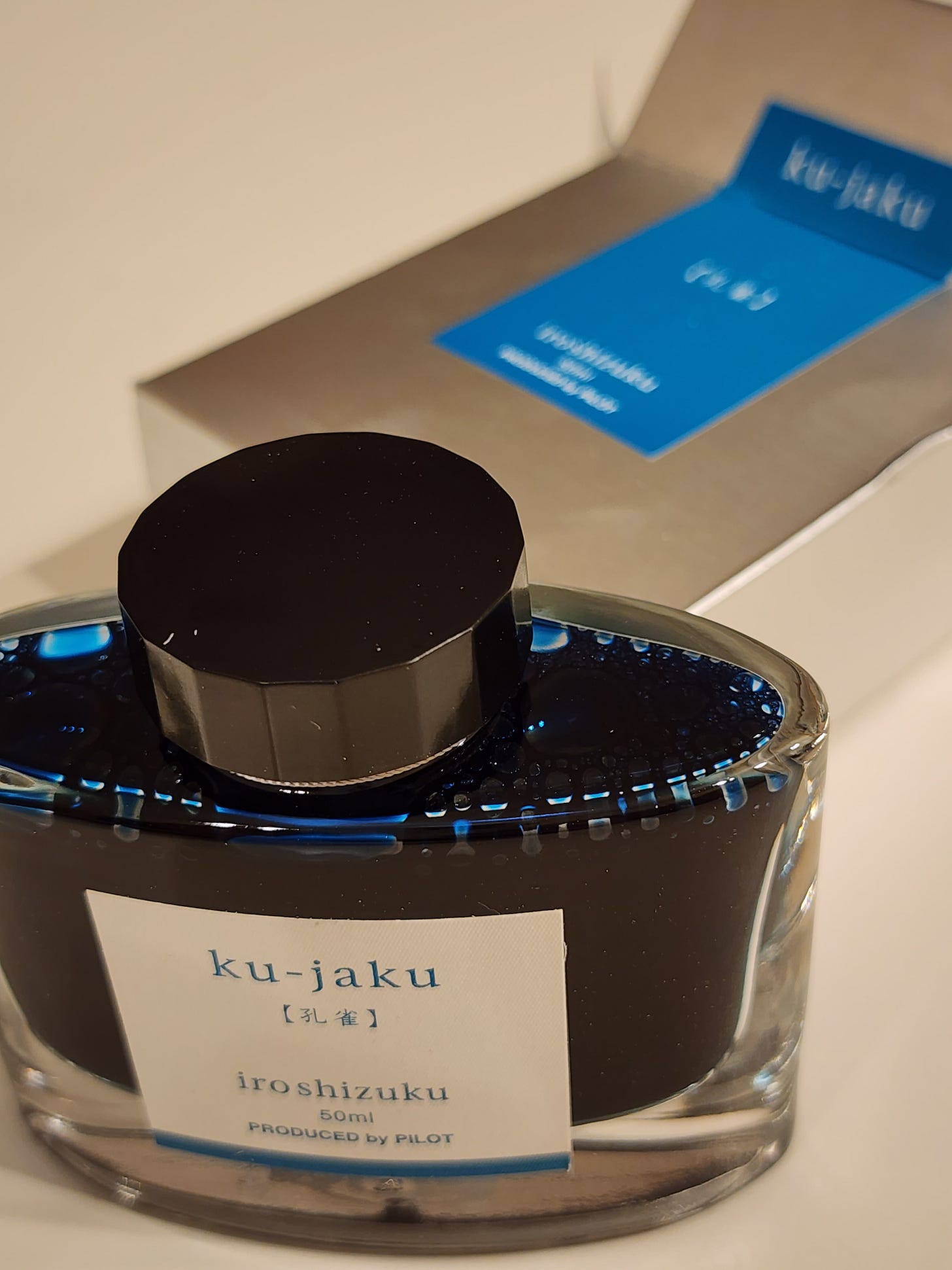 Pilot Iroshisuku Ku-Jaku. In Japanese Ku-Jaku means peacock and it’s the name of the newest fountain pen ink I got. It’s a teal blue that is somehow muted and bold at the same time and I can see it sloshing around in my demonstrator pen. So cool.
