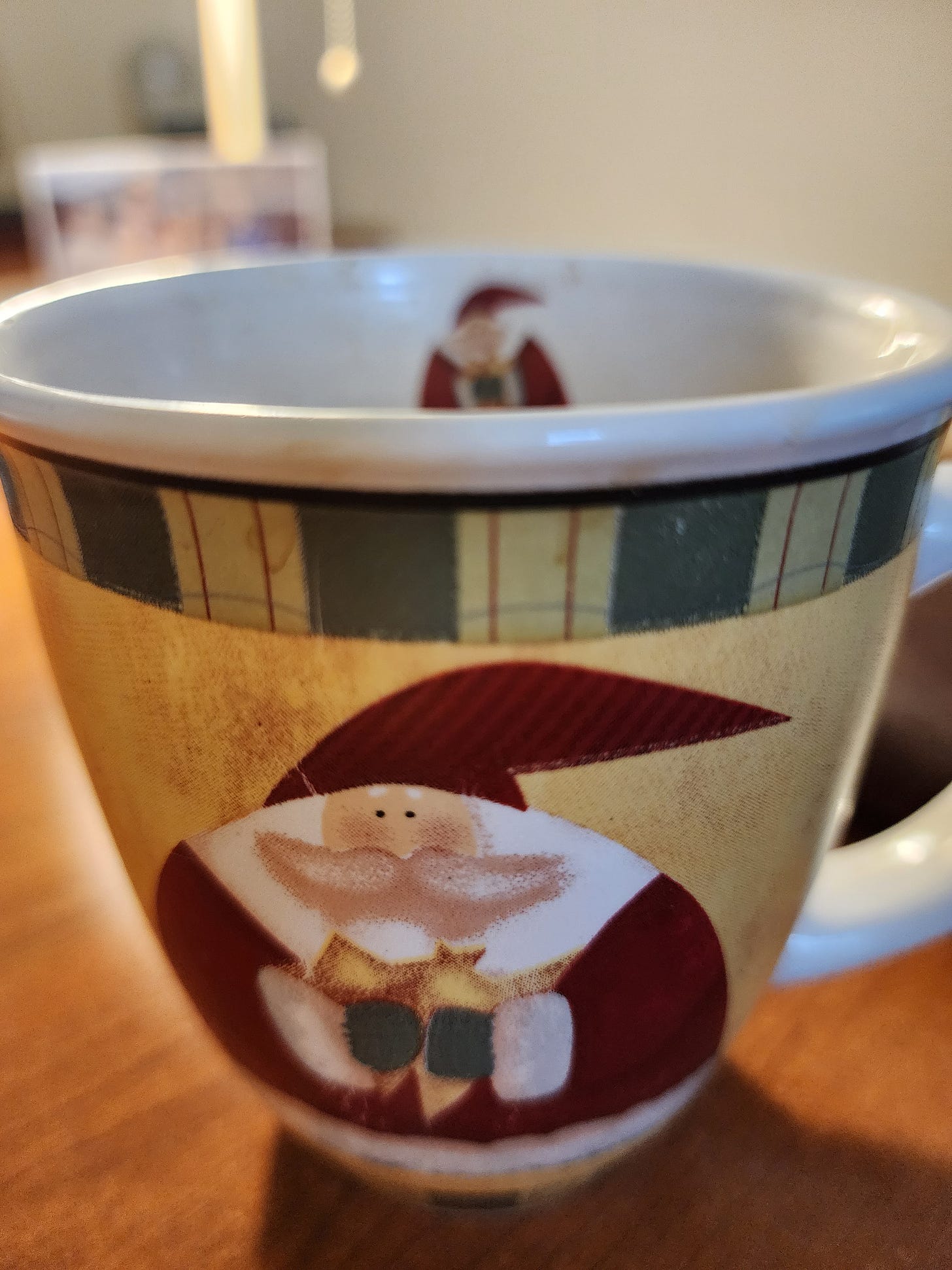 Santa Mug. I’m rarely without my morning coffee, but this time of year I drink it in my Santa mug. The little things that break up the routine add fun to the job.